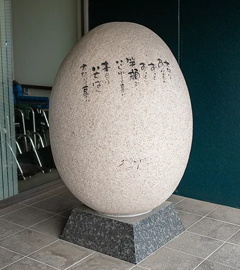 「グランドG-1」のシンボルとも言えるのが、エントランスに置かれたこの「卵のモニュメント」。御木幽石先生のことばが彫られています。こころまあるく、なにかが生まれる明るい気持ちを、エントランスで与えています。