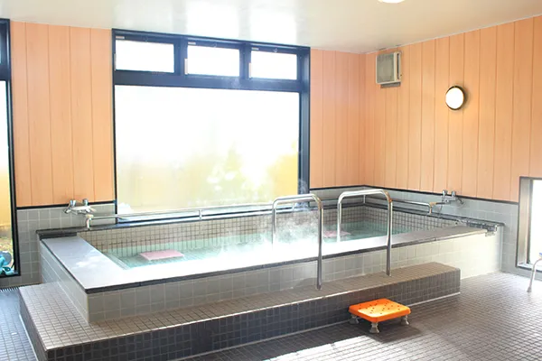 ヒノキをいっぱいに使った落ち着いた雰囲気の浴室です。個浴も用意していますので介助が必要な方も入浴が可能です。
