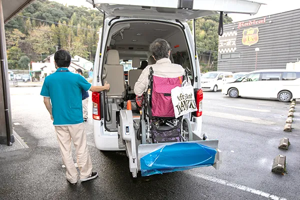 ご自宅まで専用の介護車により、送迎をおこないます。車いすの方も安心して御利用できます。
