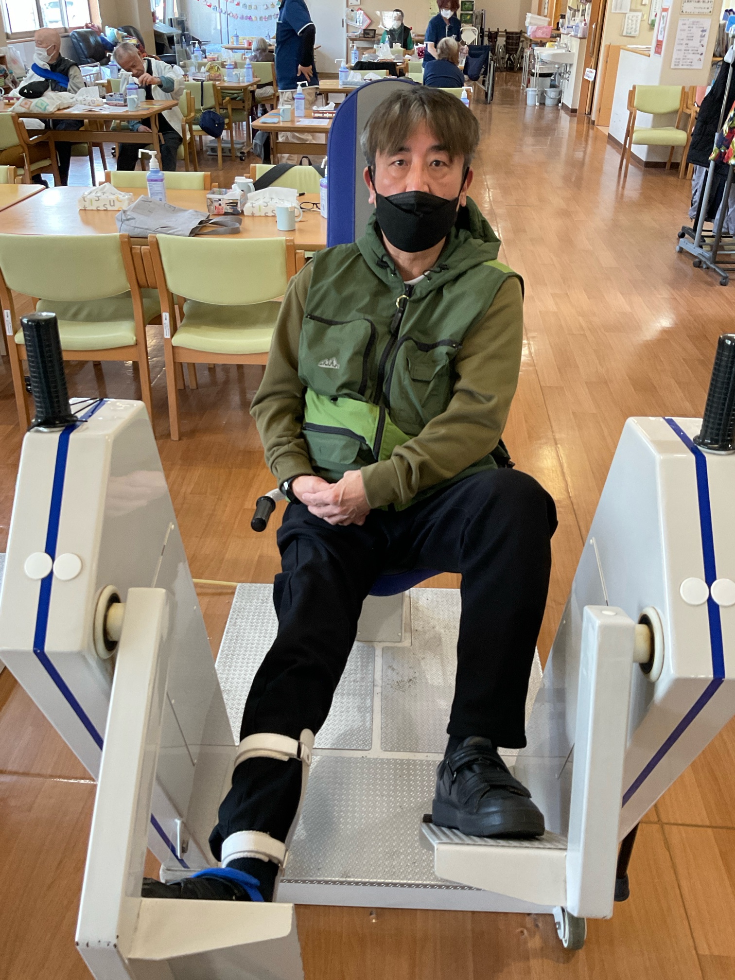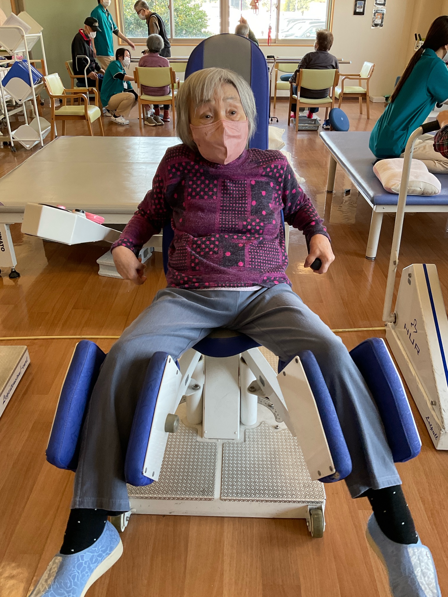 麻痺がある方は足を固定して落ちたりしないように配慮しながら運動を行っていただいています
