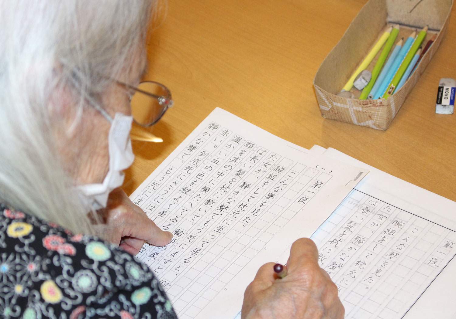 お手本を見ながら一文字一文字丁寧に美しい文字を綴られています。